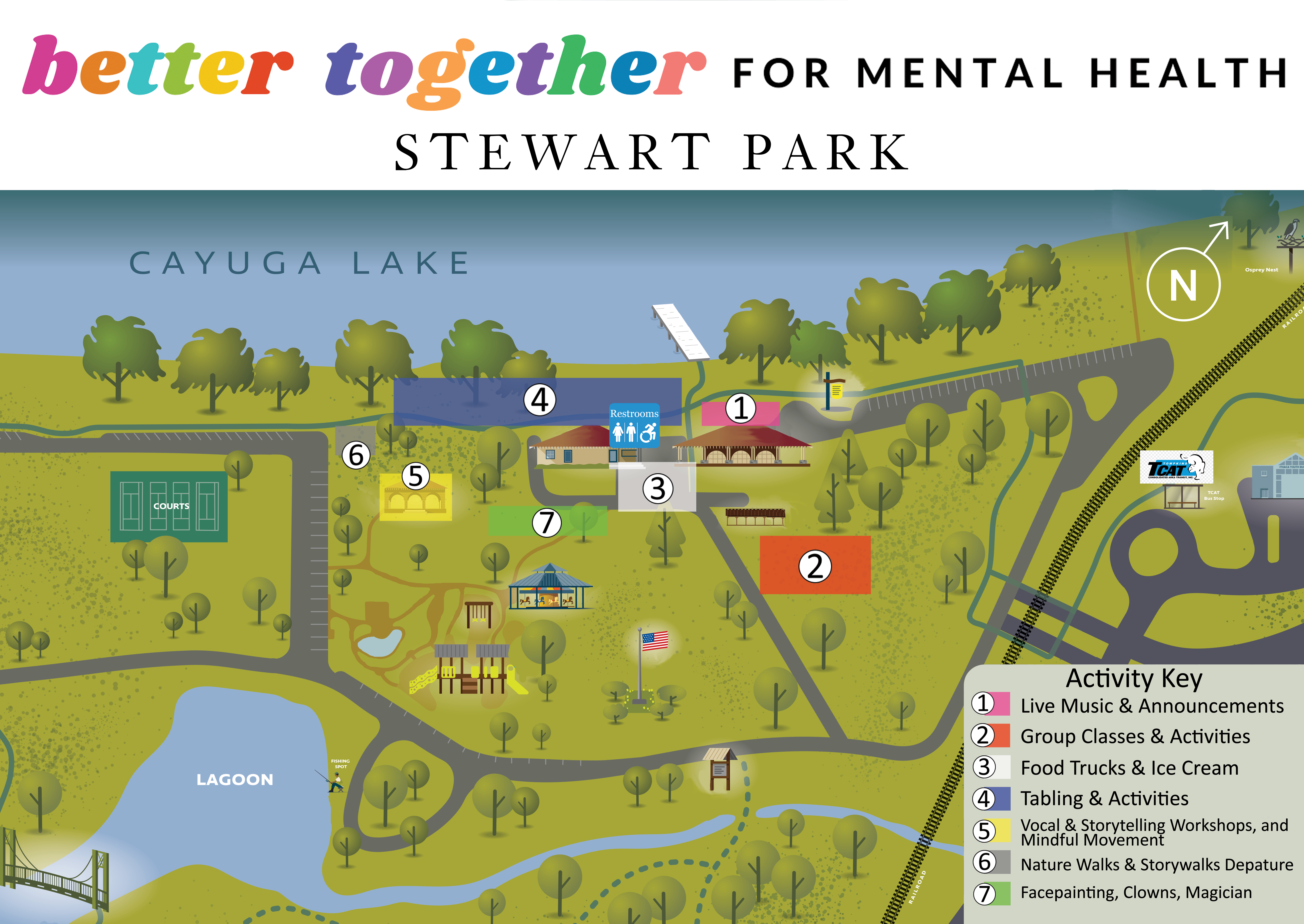 Over 40 different organizations, mental health providers, instructors, and entertainers will be spread across Stewart Park, providing opportunities for individuals and families of all ages to come together to learn about mental health, how to support ourselves, and one another through mental health struggles.